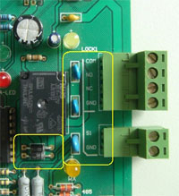 如果設(shè)置完畢后,出現(xiàn)以下異常:門開了一半就馬上關(guān)閉了,或者 關(guān)了一半又打開了。 這個(gè)是因?yàn)椋刂破骼^電器對(duì)電鎖保護(hù)電路對(duì)自動(dòng)門有副作用,請(qǐng)拆除或者剪斷繼電器旁邊的黑色的二極管。剪斷每個(gè)元件的一個(gè)管腳并翹起即可。(藍(lán)色的壓敏保護(hù)電路不用動(dòng))