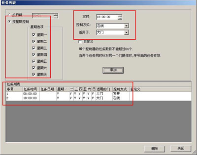 進(jìn)行定時(shí)任務(wù)設(shè)置,添加兩個(gè)定時(shí)任務(wù),設(shè)置完畢后 到 [總控制臺(tái)] 上傳設(shè)置,注意上傳完畢后,由于還沒有到啟動(dòng)定時(shí)任務(wù)的時(shí)間,所以門的系統(tǒng)還是保持在線狀態(tài).