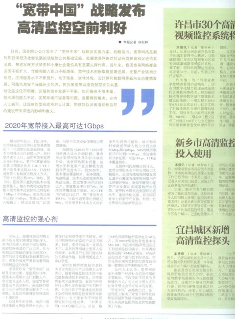 國務(wù)院印發(fā)“寬帶中國”戰(zhàn)略及實施方案,提出到2015年,要基本實現(xiàn)城市光纖到樓入戶、農(nóng)村寬帶鄉(xiāng)入村,固定寬帶家庭普及率達(dá)到50%。該戰(zhàn)略的提出為民用的普及解決了一大難題,也是民用高清監(jiān)控領(lǐng)域的一個催化劑。