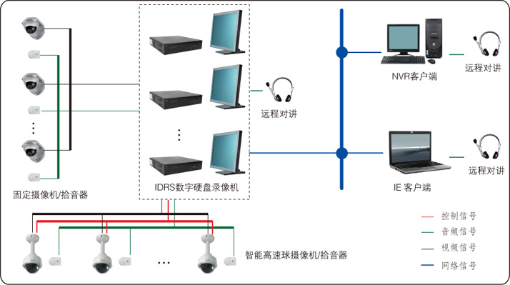 2. 一切監(jiān)控信號(hào)全部經(jīng)過視頻線纜集中傳送到學(xué)校監(jiān)控中心,接入數(shù)字硬盤錄像主機(jī),即可停止監(jiān)看、云鏡控制、錄像存儲(chǔ)、網(wǎng)絡(luò)傳輸?shù)炔僮鳌?