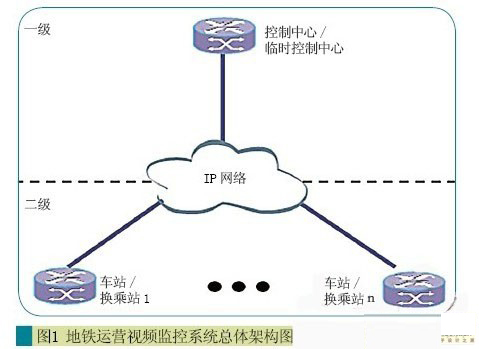 其中運(yùn)營(yíng)視頻監(jiān)控系統(tǒng)為二級(jí)架構(gòu),在車(chē)站/換乘站設(shè)立二級(jí)監(jiān)控中心,負(fù)責(zé)監(jiān)控本站相關(guān)情況,在控制/備用中心設(shè)立一級(jí)監(jiān)控中心,負(fù)責(zé)整個(gè)線路的遠(yuǎn)程監(jiān)控,架構(gòu)示意如圖1所示。