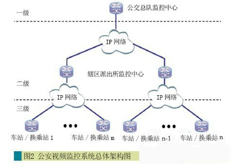 公安視頻監(jiān)控系統(tǒng)為三級(jí)架構(gòu),在車(chē)站/換乘站公安值班室設(shè)立三級(jí)監(jiān)控中心,負(fù)責(zé)監(jiān)控本站相關(guān)情況,在派出所設(shè)立二級(jí)監(jiān)控中心,負(fù)責(zé)監(jiān)控轄區(qū)所在車(chē)站/換乘站相關(guān)情況,在公交總隊(duì)設(shè)立一級(jí)監(jiān)控中心,負(fù)責(zé)整個(gè)線路的遠(yuǎn)程監(jiān)控,架構(gòu)示意如圖2所示。