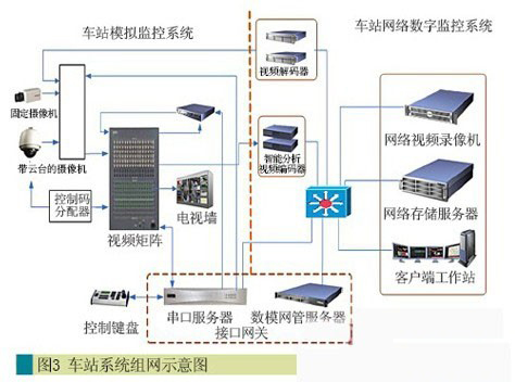 依據(jù)現(xiàn)有視頻監(jiān)控系統(tǒng)的設(shè)計(jì)建設(shè)模式,從技術(shù)實(shí)現(xiàn)方式上,車(chē)站視頻監(jiān)控系統(tǒng)可分為兩大部分:模擬監(jiān)控系統(tǒng)和數(shù)字網(wǎng)絡(luò)監(jiān)控系統(tǒng)。數(shù)字監(jiān)控系統(tǒng)作為新興技術(shù)的管理平臺(tái)兼容車(chē)站、車(chē)輛段、停車(chē)場(chǎng)的模擬視頻系統(tǒng)是必然的結(jié)果。該方案通過(guò)數(shù)字監(jiān)控系統(tǒng)的“接口網(wǎng)關(guān)”,將車(chē)站數(shù)字和模擬系統(tǒng)很好地融合起來(lái),使兩者之間能夠互聯(lián)互通、互訪互控。